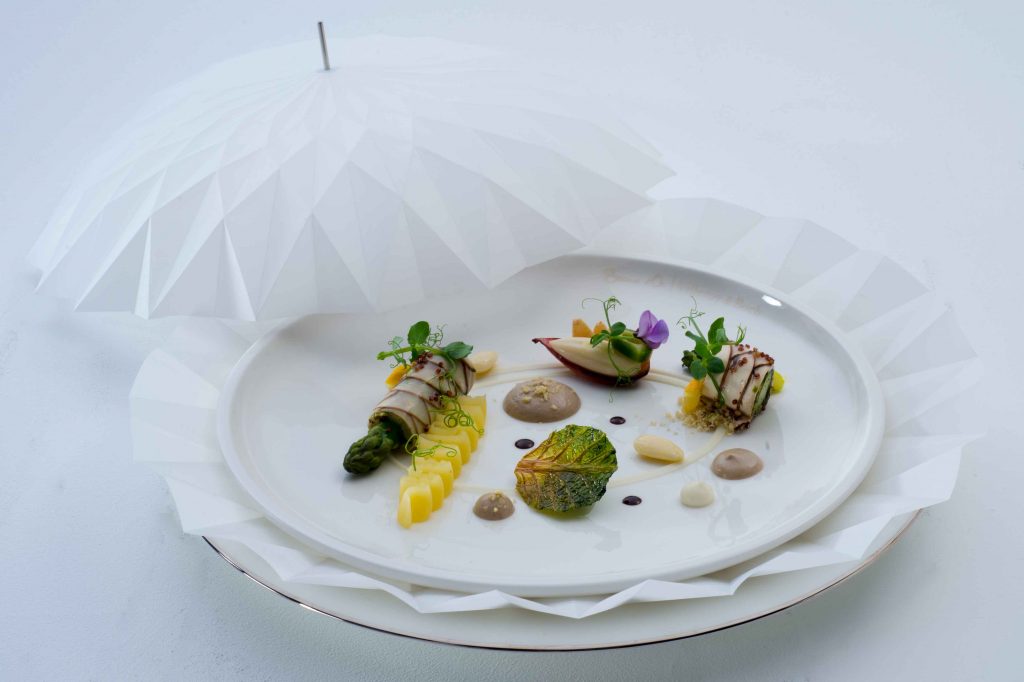 Le thème végétal a été traité avec de céléri, truffe noire, racines, citron meyer, un bouillon d’oignon aux céréales sera versé avant le service.