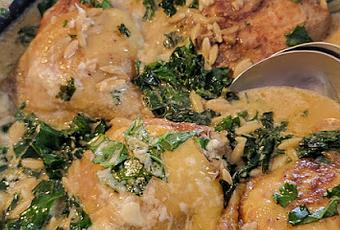 Pendant ce temps nettoyer les branches de chou kale et enlever la tige et la nervure centrale, puis couper les feuilles en morceaux - Au bout d'environ 15 minutes, ajouter la crème épaisse (j'en ai mis qu'un petit filet), le vin blanc, le jus de citron et le chou kale, en remuant légèrement pour bien incorporer le poulet sans trop remuer