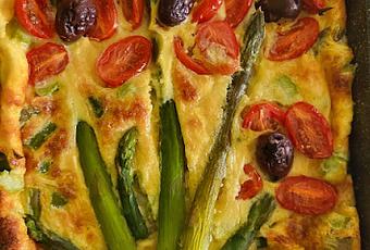 J'ai raté la présentation de ce plat. Il faut cuire cette "quiche" en 2 temps. Après la première cuisson le dessus de la quiche doit être légèrement pris avant d'ajouter la décoration. Je suppose que le dessus n'était pas encore assez cuit et ma décoration s'est noyée partiellement dans la pâte. Cette décoration devait représenter un bouquet de fleurs : les asperges vertes pour les tiges, les tomates cerises pour les pétales des fleurs et les olives pour le cœur.