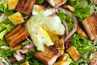 Pendant mon récent séjour à Lyon j'ai mangé dans le bouchon lyonnais l'Auberge des Canuts une salade lyonnaise et j'ai remarqué que les lardons étaient assez gros, c'est un détail, mais un détail important à mon goût.Dorénavant j'achèterai toujours un gros morceau de lard que je découperai moi-même aux dimensions que je veux. Ils sont bien meilleurs que les petits lardons déjà prédécoupés qu'on vend dans des sachets, car ils ont tendance à sécher à la cuisson.Si on les fait revenir correctement ils seront croustillants de l'extérieur et moelleux à l'intérieur. Essayer c'est l'adopter ! Officiellement on utilise de la frisée, mais on m'a servi un mélange mesclun qui me va très bien.