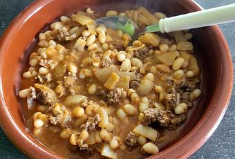 Quand les enfants étaient encore à la maison je préparais régulièrement cette recette, mais après leur départ très rarement. J'avais copié cette recette d'un livre de cuisine de ma mère. D'habitude je la faisais à partir d'un bocal de haricots en sauce tomate. Comme il me restait des haricots Paimpol au congélateur je les ai utilisés, toujours dans l'espoir de vider le congélateur. Je crains que ce ne soit qu'un vœu pieux...Ingrédients :400 g de viande de bœuf hachée2 oignons émincés1 grande boîte de haricots blancs en sauce tomate1 càs de moutarde fortesel, poivrepiment de cayenne2 càs de ketchup de tomatehuilePréparation :Faire revenir les oignons dans un peu d'huileAjouter la viande hachée et faire dorer en l'émiettant avec une fourchetteAjouter les autres ingrédients sauf les haricotsCouvrir et laisser mijoter pendant 10 minutesAjouter en dernier les haricots et laisser chauffer le toutEn ce qui concerne la moutarde, le poivre de cayenne et le ketchup on peut doser les quantités selon ses goûts. Moi j'aime bien forcer un peu sur la dose du piment de cayenne...