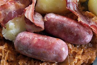 Juste avant de servir mélanger les deux portions de choucroute et servir avec du lard rissolé et des saucisses.