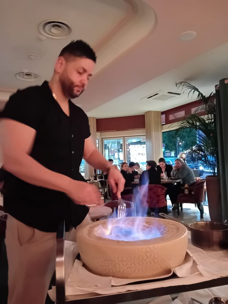Je vous suggère d’accompagner le boeuf de la spécialité de la maison : Tagliatelle ou Linguine 4 fromaggi, préparées devant vous dans la meule de parmesan et flambées, pour 29 euros. Très original. Et véritablement délicieux.