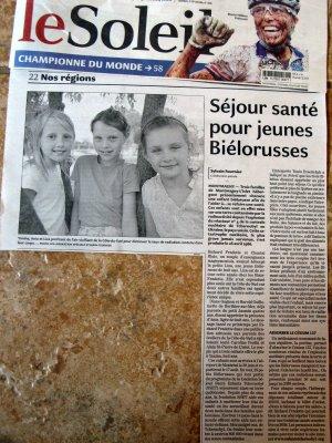 Pour le 100e article j'ai décidé de parler d'une expérience spéciale que nous vivons cet été. Depuis le 29 juin dernier nous hébergeons à la maison Ania Kamarova, elle a huit ans et vient de la la région de Moghilev en Biélorussie. C'est dans le cadre de Séjour Santé Enfants Tchernobyl qu'elle vient se refaire une santé suite à l'explosion de la centrale nucléaire en avril 1986. Le but est de faire baisser le taux de radiation dans son corps. Dans son pays tout est radié; les légumes, le lait, les animaux et l'air. Voici ce que Sylvain Fournier, journaliste bien connu dans la région a fait paraître dans l'hebdo l'Oie Blanche du 26 juillet et dans le quotidien le Soleil du lundi 28 juillet. Il a écrit deux excellents papiers qui résume bien la situation et l'expérience que nous vivons. Pour en apprendre davantage sur la Biélorussie rendez-vous sur le blog de Mikael ou sur la région de Moghilev. Bonne lecture.