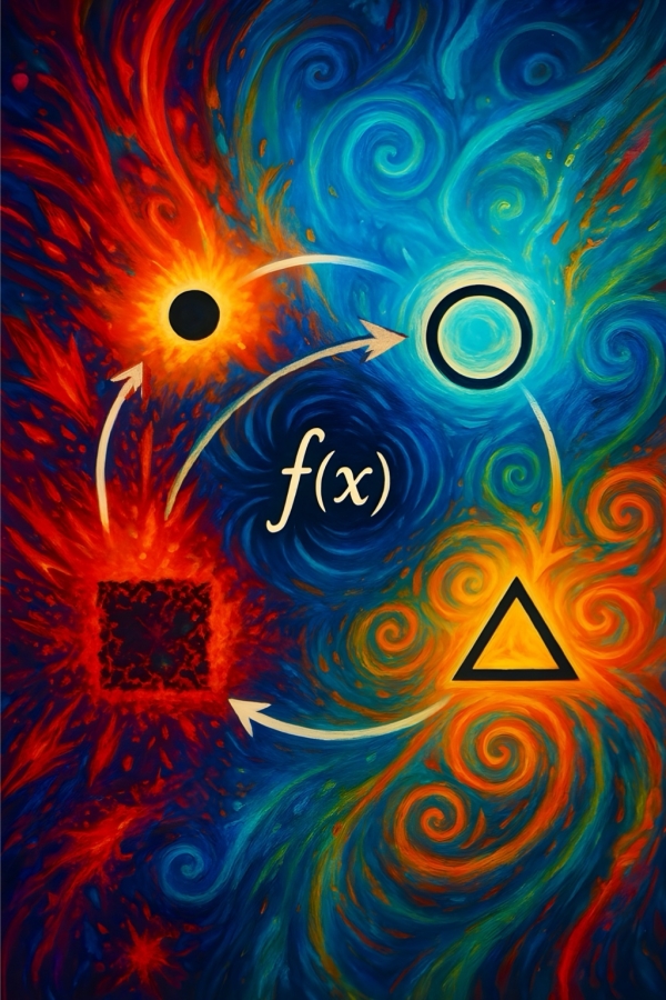 •Le texte est une axiomatique narrative, où chaque figure (Point, Cercle, Triangle, Carré) incarne une étape du champ pulsionnel avec une précision quasi-mathématique. L’opérateur f(x) formalise la dynamique fluïenne comme une fonction immanente, renforçant l’axiomatique fluïenne.
