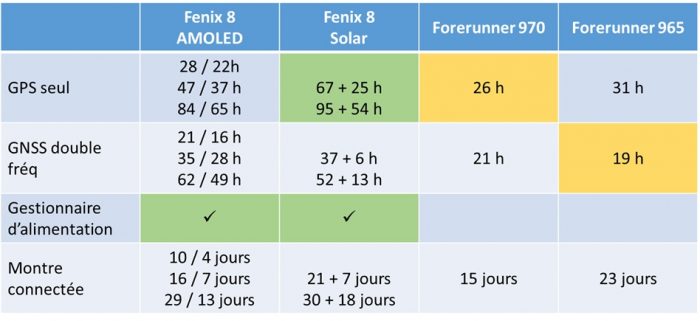 Et enfin, pour l’autonomie, avec un avantage aux versions Solar. Mais avec l’extinction automatique, l’autonomie des Fenix 8 AMOLED est déjà intéressante.