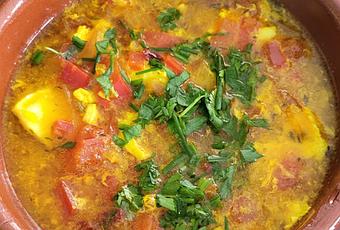 Je ne me rappelle plus comment je suis arrivée à la recette du Caldo de ovos, une soupe aux oeufs du Cap Vert. Je suis toujours à la découverte de plats que je ne connais pas et comme j'ai décidé de reprendre l'habitude de ma mère et ensuite de ma soeur de faire du samedi la journée où je mange une soupe, je suis à la recherche de recettes de soupe. J'ai publié déjà pas mal de recettes de soupes néerlandaises, donc place aux recettes d'autres pays. J'ai tout de suite aimé cette recette simple, bon marché, mais avant de me lancer j'ai comparé plusieurs recettes de cette soupe et celle que je vous présente est un mélange de plusieurs recettes que j'ai découvertes. Je vous donne les quantités un peu au pif, à vous de l'adapter à vos goûts. Quant au colorant alimentaire, j'ai utilisé un produit que j'achète en Espagne, mais vous pouvez le remplacer par du Spigol. Je ne suis pas trop fan de ces colorants, mais je dois avouer que leur couleur contribue à rendre ce plat appétissant. Et pour le peu que je l'utilise je ne pense pas qu'il ait un effet néfaste sur ma santé.Si vous remplacez le saindoux par de l'huile végétale cette soupe convient aussi aux végétariens.Ingrédients :persil