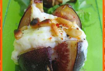 Je suis toute excitée, car je viens de repérer dans mon jardin un petit figuier qui est en train de pousser!. Oh! miracle!, moi qui n'arrêtait pas de bassiner mon mari pour qu'on en plante un. Voilà la nature qui fait bien les choses. J'adore ce fruit gorgé de soleil, tellement beau par sa robe violacée et tellement généreux à l'intérieur. Nature, cuit, avec du fromage, du jambon...on peut l'accomoder de plusieurs façons. J'ai eu envie de lui ajouter un peu de bruccio, du miel et quelques pignons, le tout servi sur un lit de salade, c'est à tomber!.