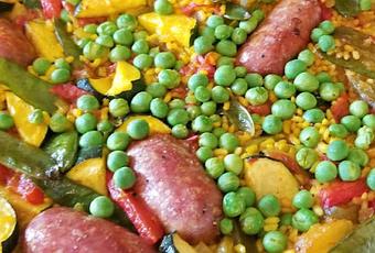 La recette d'aujourd'hui n'est pas une paella, mais un riz aux légumes auquel j'ai ajouté des saucisses italiennes au fenouil ! La cuisine fusion, comme c'est souvent le cas chez moi. J'ai fait la recette pour 4 personnes, donc j'ai divisé les quantités de la recette ci-dessous par 2. J'ai suivi la recette à la lettre, je n'aurais pas dû. J'avais déjà un doute, mais bête et disciplinée sachant d'avance que ça ne pouvait pas coller, j'ai persisté et signé. Je vous donne mon conseil : Il faut ajouter les pois gourmands à la fin en même temps que les petits pois. Si on les ajoute avant ils seront trop cuits et cela se voit sur la photo.Ingrédients pour 8 personnes :1 poivron rouge