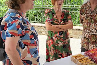 Ce jour-là il faisait très chaud et quand j'ai vu arriver ceux qui avaient opté pour une balade du "Sentier des églises" avant le repas, je me suis dit que j'avais bien fait de ne pas y avoir participé. La balade elle-même n'avait pas été difficile, mais elle a eu lieu en plein soleil. Tous sont arrivés avec la tête rouge comme une tomate. Tandis que nous, les non baladeurs, étions au frais à la salle des fêtes ou à la terrasse sous les parasols.