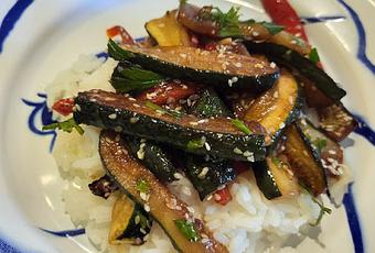 Il n'y a pas que dans la cuisine méditerranéenne qu'on utilise les courgettes, on les retrouve également dans la cuisine asiatique. J'ai bien aimé cette recette qui est simple à réaliser et qui change un peu de ce qu'on a l'habitude de préparer avec les courgettes.Ingrédients :2 courgettes 1 poivron rouge 8 gousses d'ail 4 cuillères à soupe d'huile d'olive 1 cuillère à soupe de sucre 1 cuillère à soupe de graines de sésame 1 cuillère à café de piment 100 ml de sauce soja sel 4 brins de persilVoici la vidéo de la recette :
