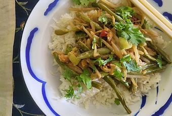 De ma barquette de germes de haricots mungo il m'en restait encore la moitié et j'ai trouvé cette recette pour les accommoder. Ingrédients :250 g de riz basmati75 g de cacahuètes non salées350 g de haricots vertsquelques oignons de printemps1 piment rouge2 gousses d'ail2 cm de gingembre1 bâton de citronnelle½ càs de curry½ càs de paprika½ càs de sucre cassonade brunesauce soja250 ml de lait de coco100 g de germes de haricots mungocoriandre fraîchePréparation :Cuire le riz avec une pincée de sel selon les instructions sur l'emballageConcasser les cacahuètes et émincer finement le pimentPeler et hacher finement l'ailPeler et hacher finement le gingembreÉcraser et hacher finement la citronnelle et émincer les oignons nouveaux en rondellesChauffer un filet d'huile (à l'ail) dans une poêle et faire revenir le curry et le paprika pendant environ 2 minutesAjouter le piment, l'ail, la citronnelle, le gingembre et le blanc de l'oignon nouveau et faire revenir brièvementNettoyer les haricots verts et couper éventuellement en deuxAjouter les haricots verts, les cacahuètes et la cassonade et faire sauter pendant environ 4 minutesDéglacer avec la sauce sojaEnfin, ajouter le lait de coco et l'oignon nouveau restant, puis laisser mijoter brièvementAjouter au dernier moment les germes de haricots mungoHacher grossièrement la coriandreServir les haricots sautés avec un bol de riz blanc et garnir de coriandre fraîche. Recette de 24 Kitchen