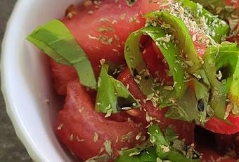 Mélanger la vinaigrette avec les tomates et parsemer le tout avec quelques feuilles de basilic.