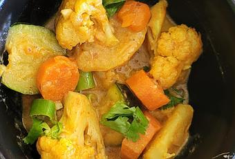 Un curry de légumes crémeux au lait de coco, délicatement épicé et garni de légumes tendres. Mon problème c'est qu'il fallait un chou-fleur... Et qui dit chou-fleur pour 1 personne = au moins 3 repas à inventer avec. Heureusement que j'aime bien ce légume.