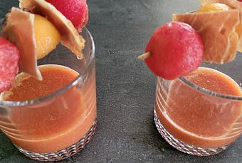 A l'aide d'une cuillère parisienne réaliser des billes de melon et de pastèque, en total 6