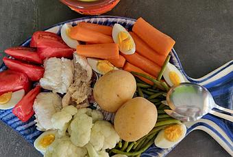 Couvrir d’eau froidePorter sur le feuDès le premier frémissement, retirer la casserole du feuLa morue ne doit surtout pas bouillir, car elle durciraitLaisser pocher 10 minutes environ dans l’eau bouillanteCuire les œufs 10 minutesNettoyer tous les légumesCuire les légumes, sauf les tomates, séparément pour respecter le temps de cuisson de chaqueDresser tous les légumes sur une assiette
