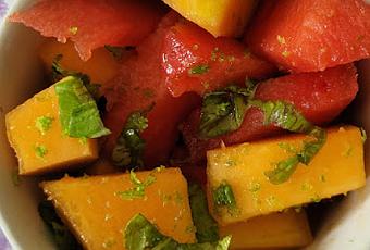 Ingrédients : 1 melon du pays 1/4 de pastèque le zeste d’un citron vert bio râpé quelques feuilles de menthe fraïche 1 bouchon de pastis 1 filet d’huile d’olive quelques feuilles de basilic frais Préparation: Couper la pastèque et le melon en cubes pas trop petits et les déposer dans un plat plutôt que dans un saladier profond pour éviter que les fruits ne s’écrasent Assaisonner avec le zeste du citron vert râpé, le bouchon de Pastis et les feuilles de menthe ciselées finement Ne pas mélanger pour éviter d’abimer les morceaux de melon et de pastèque Servir en rajoutant un filet d’huile d’olive et quelques feuilles de basilic.