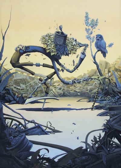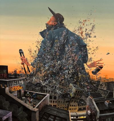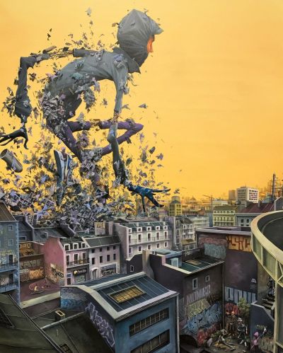 Ses fresques et toiles présentent souvent des membres allongés, des objets flottants et des paysages luxuriants mais délabrés, créant un surréalisme urbain à la fois ludique et d'une subtile portée critique.