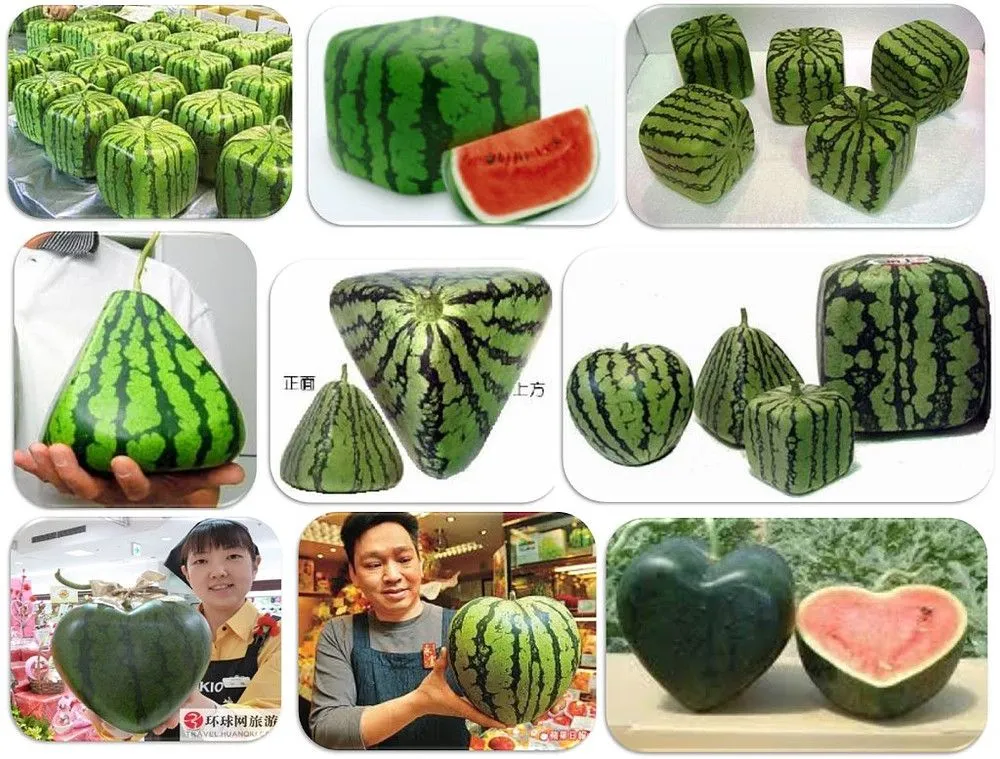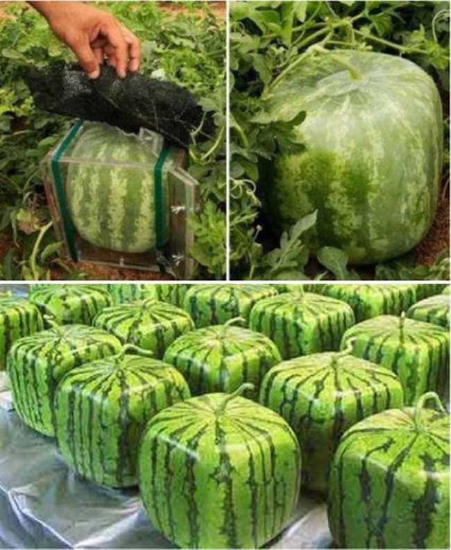 Quelle ne fut pas alors ma joie d’apprendre que certains fruits rentrent littéralement dans les cases, comme des pastèques carrées qui sont vendues régulièrement au japon, aux states et en allemagne. Leur prix est prohibitif et leur goût pas fameux, mais quel plaisir à ranger ! Il s’agirait de l’invention de l’artiste et horticulteur Tomoyuki Ono, inspiré par des productions du village de Zentsuji dans la province de Kagawa, qui aurait même déposé un brevet en 1977 ! En gros, on confine une pastèque en maturation dans un moule cubique.