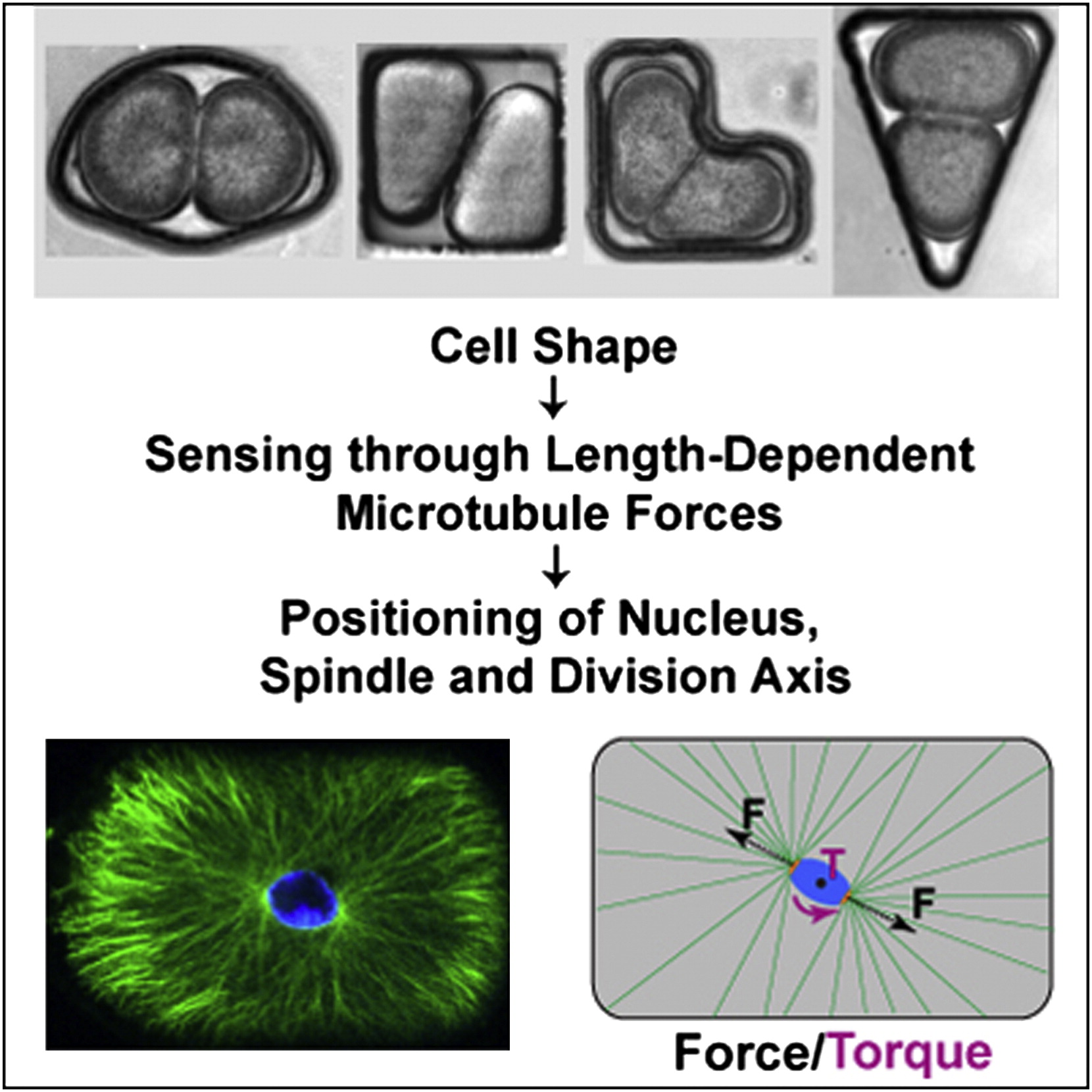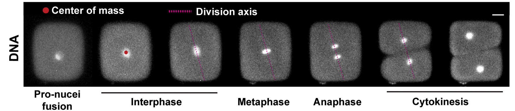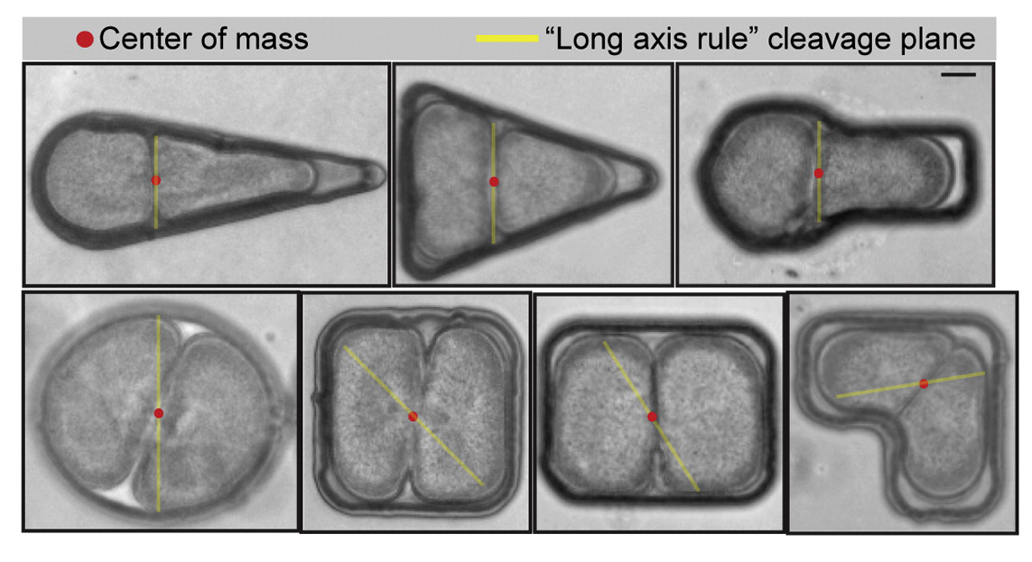 Mais d’ailleurs pourquoi diable contraindre ainsi la forme de ces cellules ? Et bien ce qui intéresse Nicolas Minc, c’est de comprendre comment une cellule va se diviser lorsqu’on change ainsi sa forme. L’idée était notamment de tester une règle empirique, la règle de l’axe long ou règle de Hertwig, censée prédire l’axe de division d’une cellule en fonction de sa forme. Pour déterminer cet axe, il faut localiser le centre de masse de la cellule et identifier l’axe le plus long qui traverse ce point : la division devrait se faire alors perpendiculairement à ce grand axe.