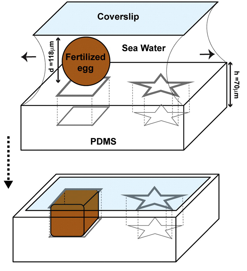 Ces moules sont réalisés en PDMS (Polydiméthylsiloxane) qui est à la base des caoutchoucs silicones et propice à la microfabrication de structures aux formes et dimensions hyper précises. Et ici, vu que les oeufs d’oursins fraîchement fécondés ont une forme parfaitement sphérique aux dimensions connues, on peut préparer des moules légèrement moins grand pour que, lorsqu’on dépose une lamelle de verre, celle-ci pousse et aplatit les oeufs dans chaque moule, les y confine et les oblige à adopter la forme géométrique d’intérêt.