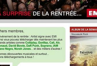 Le site de téléchargement de musique gratuite financé par la publicité vient d'annoncer sur son blog avoir signé un accord avec EMI.Après inscription sur la plate-forme , vous pourrez désormais télécharger gratuitement et sans DRM une grande partie du catalogue de la majors (COLDPLAY, GORILLAZ, CALI, AIR...).Chaque téléchargement gratuit est précédé d'une publicité d'une vingtaine de secondes à visionner dans son intégralité.Plus d'infos sur le site d'AIRTIST