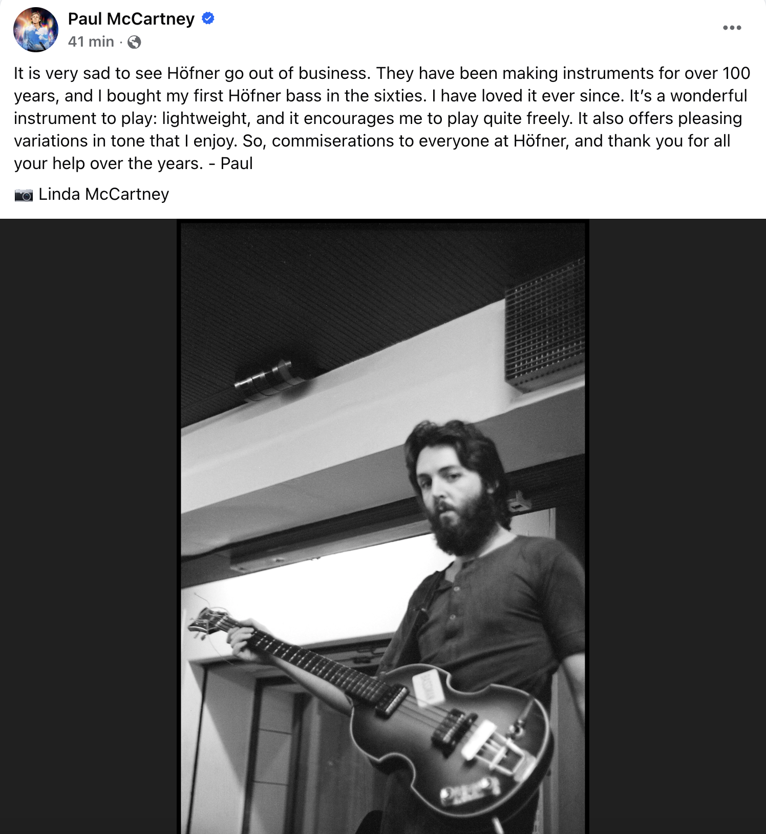 Paul McCartney, qui a fait de Höfner le fabricant de sa basse fétiche a réagi :