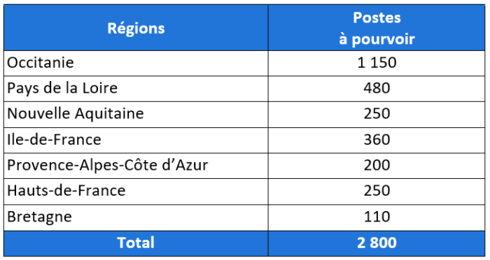 - Plus de 2 800 postes sont à pourvoir dans 7 régions, dont 1 150 en Occitanie et 480 dans les Pays de la Loire.