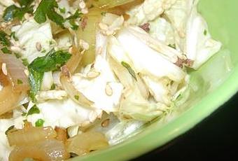 Laver le chou Chinois et le couper finement en lamelles et le mélanger avec 2 CS de graines de sésame.