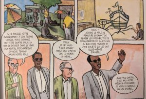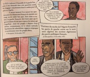 Le roman graphique s’ouvre sur un « moment convivial » qui montre bien la nature de leurs relations. Sartre, Beauvoir, Lanzmann et Fanon trinquent ensemble, mais alors que Simone et Jean-Paul s’écrient « À la vie ! À la liberté ! » Fanon répond : « À l’Algérie et à l’Afrique libres ! » À eux de dire « À Frantz Fanon ! » et à lui de répondre « À la décolonisation des corps... et des esprits ! ». Avec l’ethno-psychiatre martiniquais, les valeurs abstraites n’ont de cesse de s’incarner.