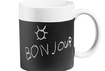 Le matin, je suis plutôt du genre à avoir du mal à émerger, et il vaut mieux éviter de me parler sous peine d’entendre quelques grognements. Je viens de trouver un mug avec ardoise qui ravira mon cher et tendre s’il veut me faire passer un message quelconque au petit déjeuner. On commence par le mug remplit de café ”bonjour ma chérie”, avec un petit coeur…