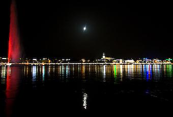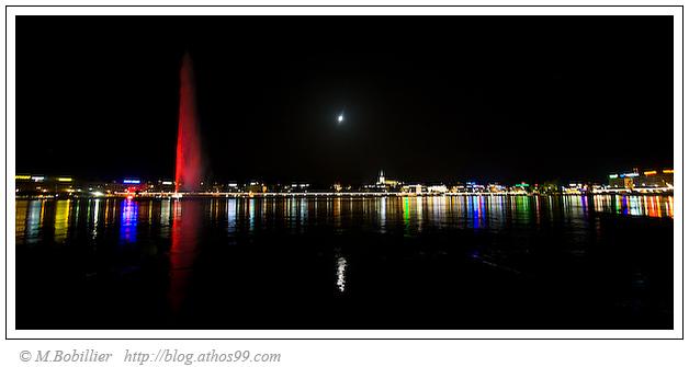 Une vue de la rade de Genève avec le Jet d’eau et la lune depuis les bains des Pâquis, photographie faite à main levée. Canon 40D 1/2s F/4.5 f=10mm ISO=1600