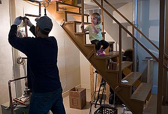 Les plombiers circulent, coupent, soudent et vissent dans notre sous-sol depuis deux jours. Agathe est très intéressée par la plomberie, elle s'installe dans l'escalier et les abreuve de questions :