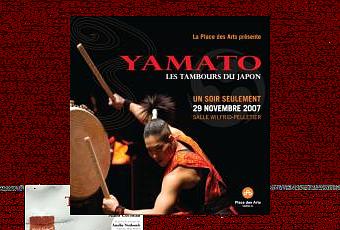 Un énorme tambour japonais (paraît que ça s'appelle des taïkos) au fond de la scène.Les autres taïkos sont disséminés sur le devant de la scène puis le rideau se lève.