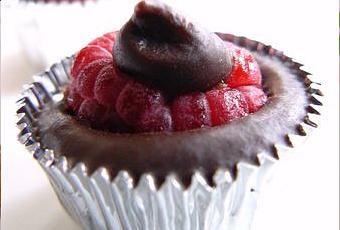 Versez une grosse goutte de chocolat au fond de chaque barquette, elle doit remplir environ la moitié de cette barquette. Posez une framboise dessus et appuyez un peu pour faire remonter le chocolat jusqu'au bord.