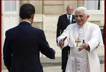 En arrivant sur le tarmac de l'aéroport d'Orly, près de Paris, Benoît XIV, une riche croix en or qui faisait "bling bling" sur sa poitrine de blanc vêtue, était accueilli par Nicolas Sarkozy et son épouse. Chacun s'est livré à des conseils en laïcité, en France, l'un des pays inventeurs du concept.