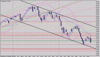 Nous observons ainsi, sur le graphe hebdomadaire, une nouvelle bougie noire qui ne confirme pas le marubozu noir de la semaine dernière dont la violence, en "éclatant" l'important support des 4288 points, pouvait faire craindre le pire par un nouveau mouvement baissier d'envergure.
