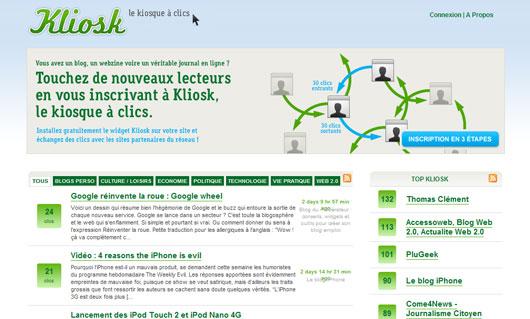 Un nouveau service Web 2.0 vient de sortir courant mois d’aout 2008 : Kliosk. C’est quoi ce nom barbare ? Kliosk est en définitive un service générant de nouvelles sources de trafic pour votre site ou blog. “Vous avez un blog, un site et vous souhaitez toucher de nouveau lecteurs. Le service entièrement gratuit vous propose d’installer un widget sur votre site ou blog et de renvoyer à leur tour du trafic vers les autres sites ou blogs référencés sur le site Kliosk.com