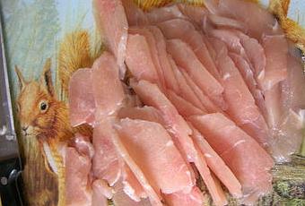 Un bon morceau de beurre dans une sauteuse,les tranches d'escalope et les pêches coupées en morceaux.