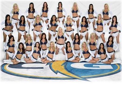 Ça ne doit pas être facile de supporter les Chargers de San Diego ces temps-ci après deux défaites crève coeur en ce dénut de saison. Heureusement pour les partisans des Chargers, il fait beau et chaud à San Diego et ils ont les Charger Girls. Ce "squad" de cheerleaders est sûrement un des plus beaux de la NFL avec plusieurs très jolies, et je dois l'avouer majoritairement pulpeuses, californiennes. En voici quelques-unes :