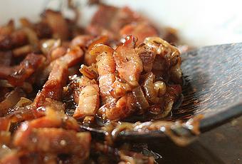 Au dernier moment ajouter l'huile et le vinaigre au petits lardons.