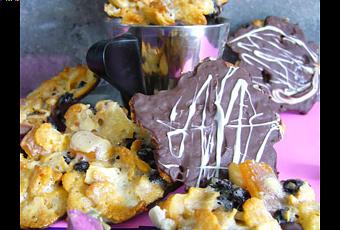 Me restant pas mal de fruits secs entamés, je me suis inspiré des Florentins de Julie Andrieu pour réaliser cette recette. Simple, rapide (quoi que j’ai eu un peu de mal avec le chocolat, mais ça c’est certainement un manque de pratique !) j’en était où ? A oui,….. délicieux pour déguster avec un petit café ou tard devant la télé !