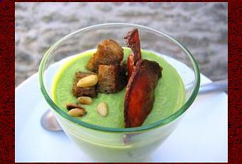 5. Verser le velouté glacé dans des coupelles et décorer de rondelles de chorizo, de croûtons et de pignons.