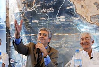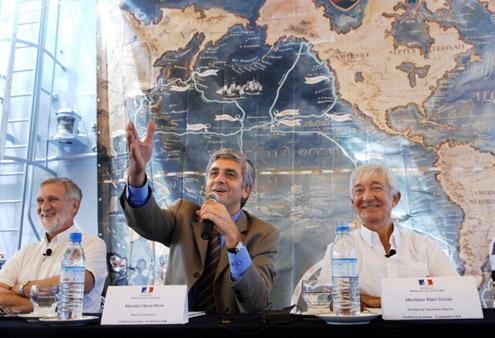 Photo : Le ministre de la défense Hervé Morin, entouré du chef d’Etat-major de la Marine française, l'amiral Jean-Louis Battet, et du président de l'association Salomon, Alain Conan, ont annoncé le 16 septembre 2008 à Nouméa, le coup d'envoi de la huitème et dernière campagne de fouilles sur le site du naufrage des navires de l'explorateur La Pérouse aux îles Salomon en 1788 (Marc Le Chelard/AFP).extrait d'un article paru dans le Lacroix.com