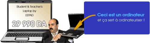 M. Nouar Harzellah, Pdg du Fournisseur d’Accès à Internet algérien EEPAD a annoncé, au courant de la conférence de presse tenue au forum du quotidien El Moudjahid, que son entreprise vendra des ordinateurs portables à destination d’élèves, d’étudiants et d’enseignants au courant du mois prochain (octobre 2008). On apprend aussi que ces ordinateurs portables seront montés à l’usine Zala d’Annaba, appartenant à l’EEPAD.