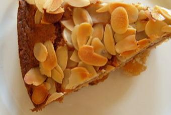 Versez l'appareil dans un moule à bords hauts (genre moule à fond amovible, à charnière, passé maître ès-gâteaux), cuire 40 minutes à feu doux th. 6. Laissez refroidir avant de démouler, puis de napper le dessus de miel et de saupoudrer des amandes effilées.