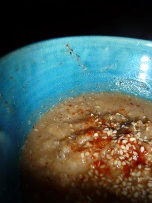 Une belle cuillère à soupe de crème de soya, d'avoine ou même une pointe de Tahini ^^ Saupoudrez d'une dernière volée de graines de sésame torréfiées et...