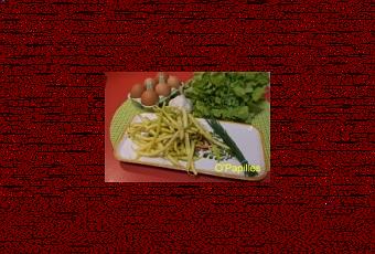 Il faut prévoir 150g de haricots beurre, 6 ou 8 oeufs, 1 gousse d'ail, de la ciboulette, du beurre, de l'huile d'olive, du sel et du poivre.