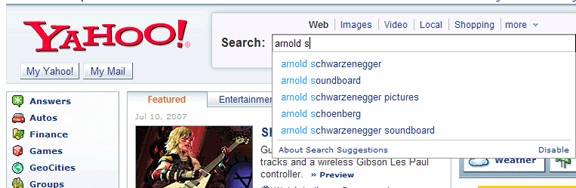Yahoo! annonce sur son blog la mise en place d'une fonctionnalité (autrefois appelé "Live Search") qui était déjà disponible sur sa barre d'outils Firefox depuis quelques temps avec des suggestions de recherche au fur et à mesure de la saisie d'une requête dans le formulaire de recherche son moteur, à la manière de l'outil "Google Suggests".