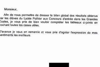 Ensuite ce papier demande à ce que je renvoie mes résultats pour dresser un bilan global. Seulemnt l'an dernier il ne m'a pas été accordé la période de révision que j'avais demandé pour mes concours, toute remarque concernant les condittions de travail a été rejetée (insalubrité des salles, mauvaises conditions de sécurité...) et enfin ils n'ont pas hésité à anéantir des dossiers scolaires pour leur bon plaisir (c'est le système prépa !) et n'étant pas concerné par ce dernier point je peux parler objectivement.
